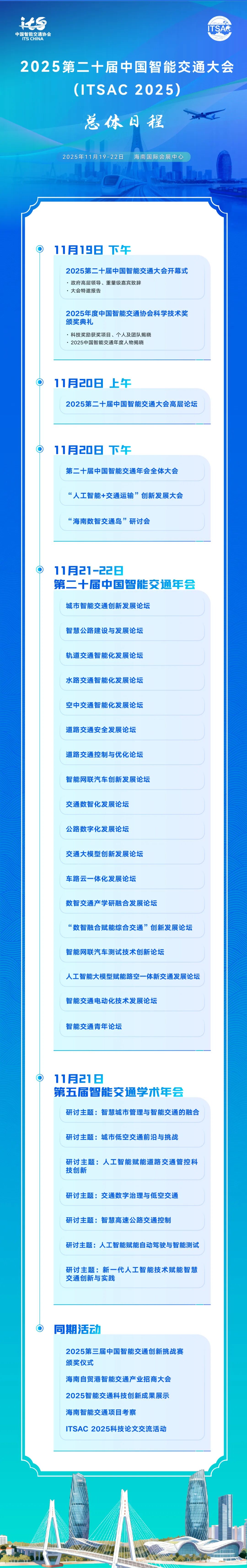 大会由中国智能交通协会主办、海南省交通投资集团有限公司承办,以“人工智能——智能交通高质量发展新动能”为主题、第二十届中国智能交通年会为主体,举办领域覆盖广泛、内容形式丰富的各类会议,其中包括大会高层论坛、年会全体大会等综合高级别会议,“人工智能+交通运输”创新发展大会主论坛,城市智能交通、智慧公路、空中交通、道路交通控制与优化、道路交通安全、轨道交通、水路交通等领域论坛,数智融合赋能综合交通、车路云一体化、智能网联汽车测试、智能交通电动化技术、交通大模型、交通数智化等专题论坛,以及“海南数智交通岛”研讨会、数智交通产学研融合发展论坛等特色会议。